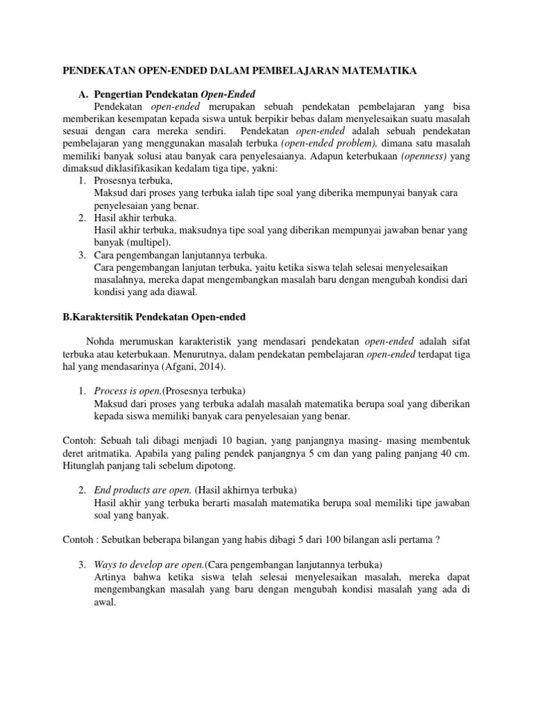 Penelitian "pengembangan soal matematika berbasis open ended di kelas. Cara unik jawab contoh soal open ended matematika sd kelas 5 dengan matematika ajaib adalah cara ajaib menjawab contoh soal open ended . Keliling sebuah persegi panjang = 350 cm. Berdasarkan kenyataan maka perlu dikembangkan pembelajaran matematika yang dapat memberikan keleluasaan kepada siswa untuk berpikir secara aktif dan kreatif, . Dalam gedung pertunjukan disusun kursi dengan baris paling depan .