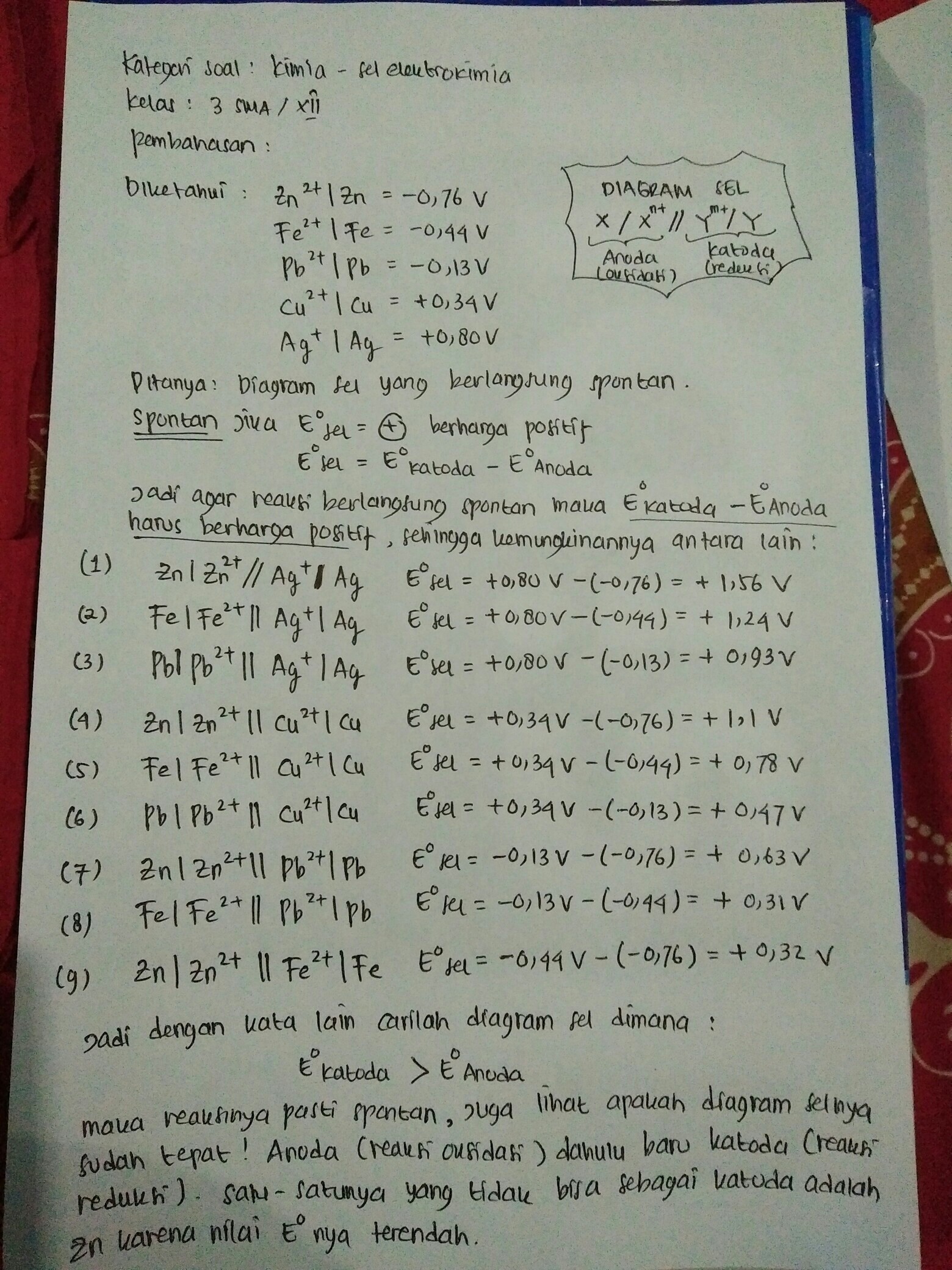 Pada materi ini mempelajari secara umum : Tuliskan persamaan reaksi sel yang dapat berlangsung spontan. Tentukan potensial standar sel itu c. Tentukan potensial standar sel itu c. Mencari sel volta dan potensial standar sel(e°sel) serta reaksi sel dan elekrode.cara mudah belajar kimia sma.